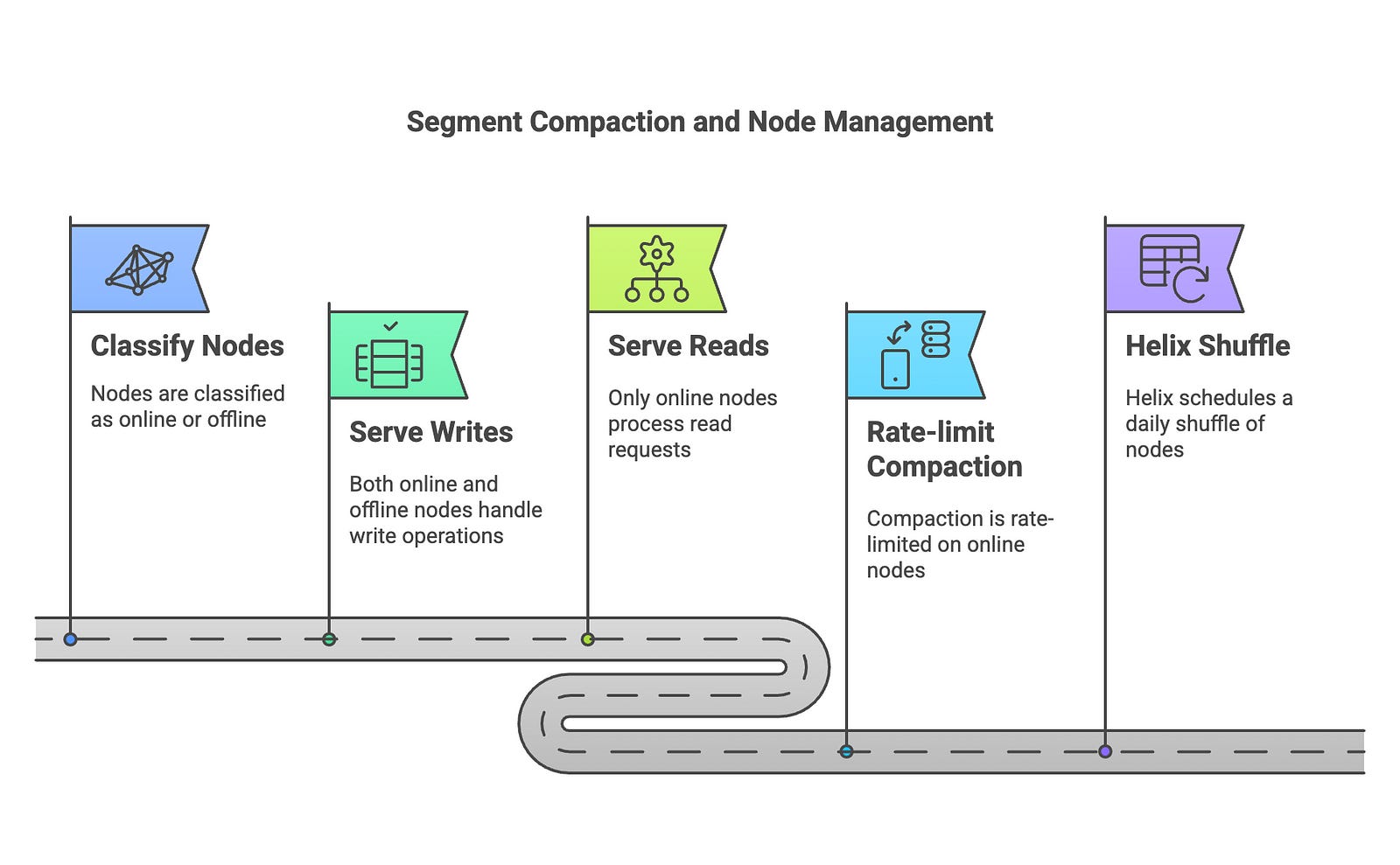 Segment Compaction on Nodes: As HRegion is a LSM-Tree based database, segments on disk needs to be merged and compacted. This merging process can eat up resources on a node and could lead to slower writes and read. To fix this issue, they developed the following mechanism ~