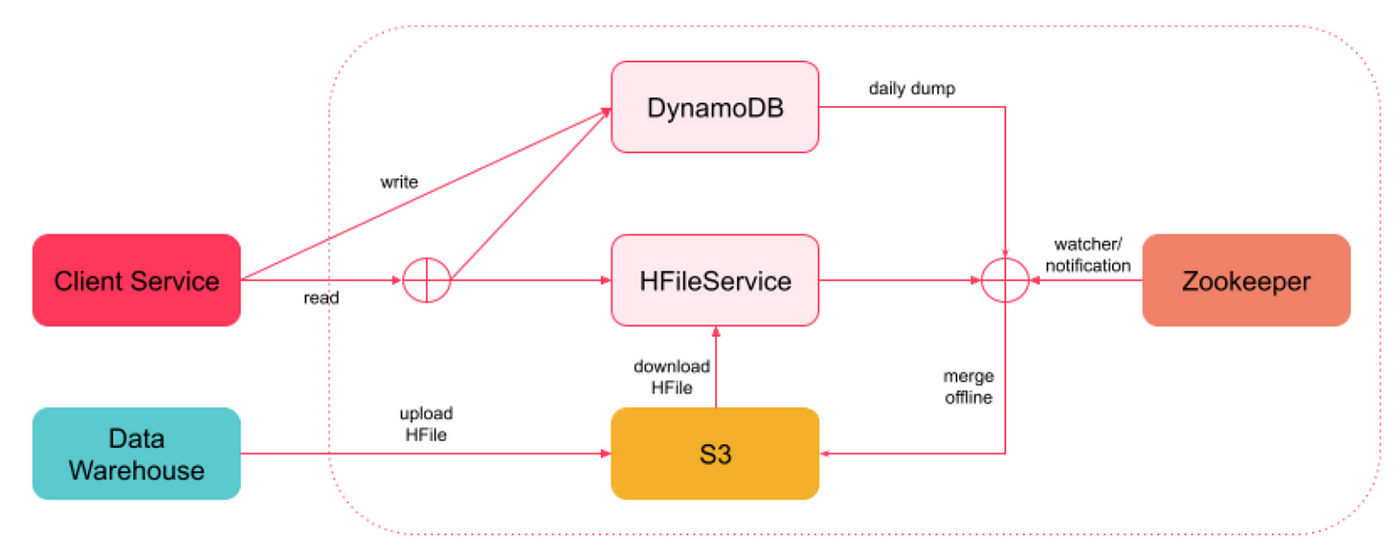 For read requests from client, data is read from both the HFile and the DynamoDB and is then merged based on timestamps.
