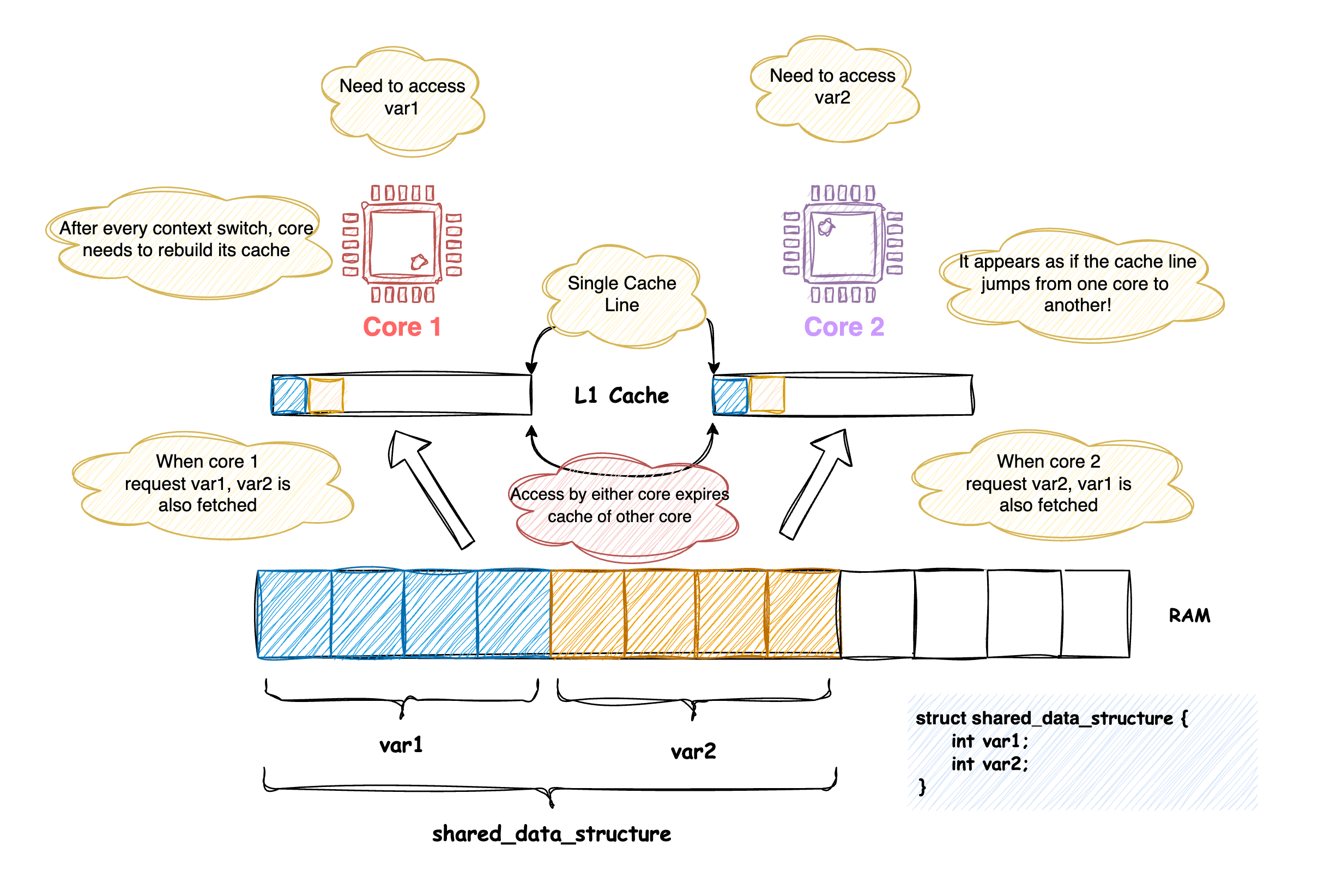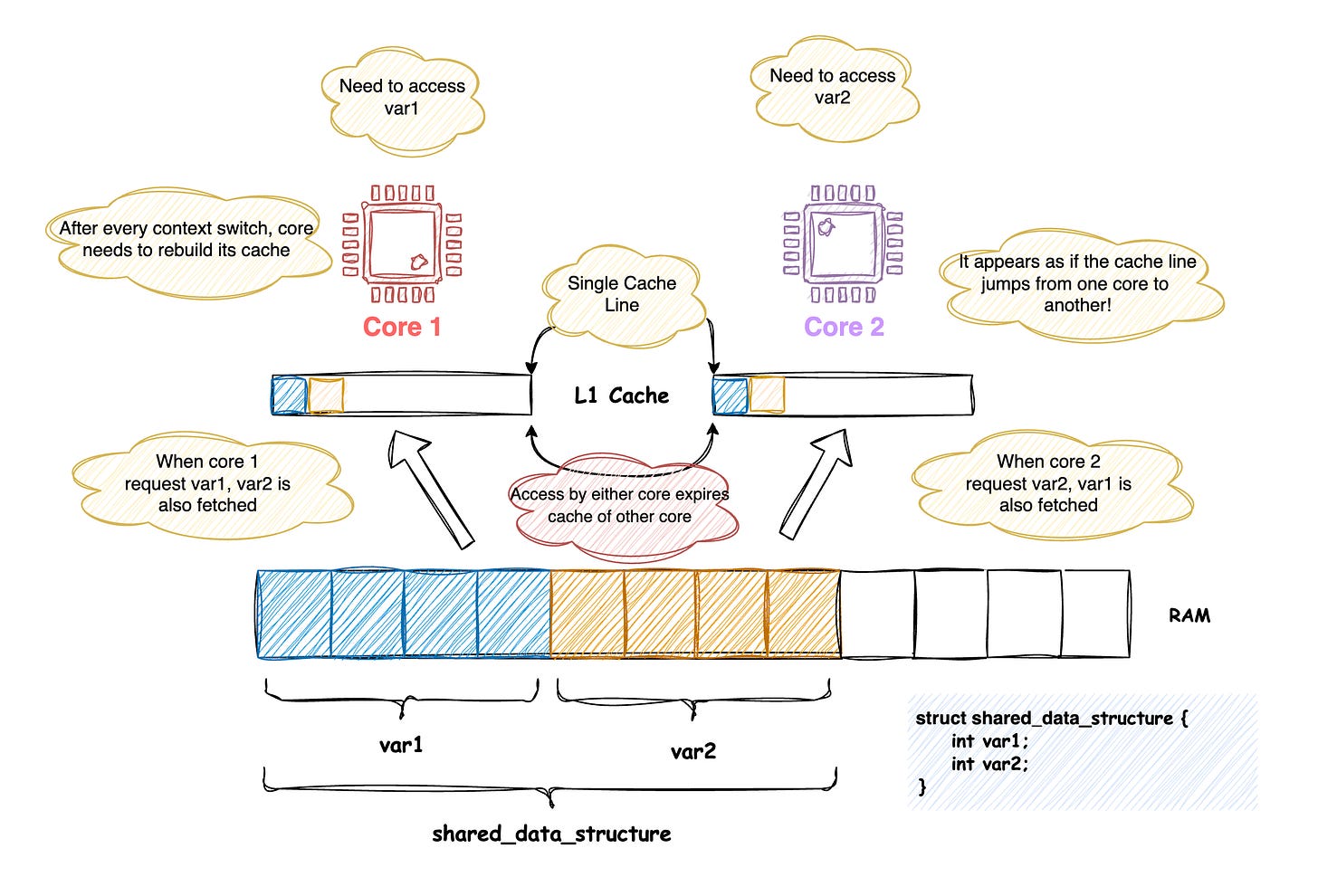 Now comes the interesting part… If two variables accessed by different CPU cores are placed in memory such that they reside on the same cache line, they will be fetched and updated together. This can lead to subtle and serious performance problems.